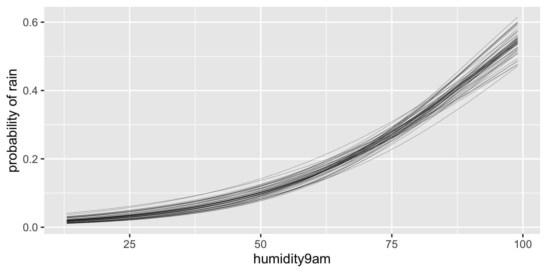 labs(y = "probability of rain")\[\begin{equation} \log\left( \frac{\pi}{1-\pi}\right) = \beta_0 + \beta_1 * 99 \;\;\;\; \text{ and } \;\;\;\; \pi = \frac{e^{\beta_0 + \beta_1 * 99}}{1 + e^{\beta_0 + \beta_1 * 99}} \; . \end{equation}\]