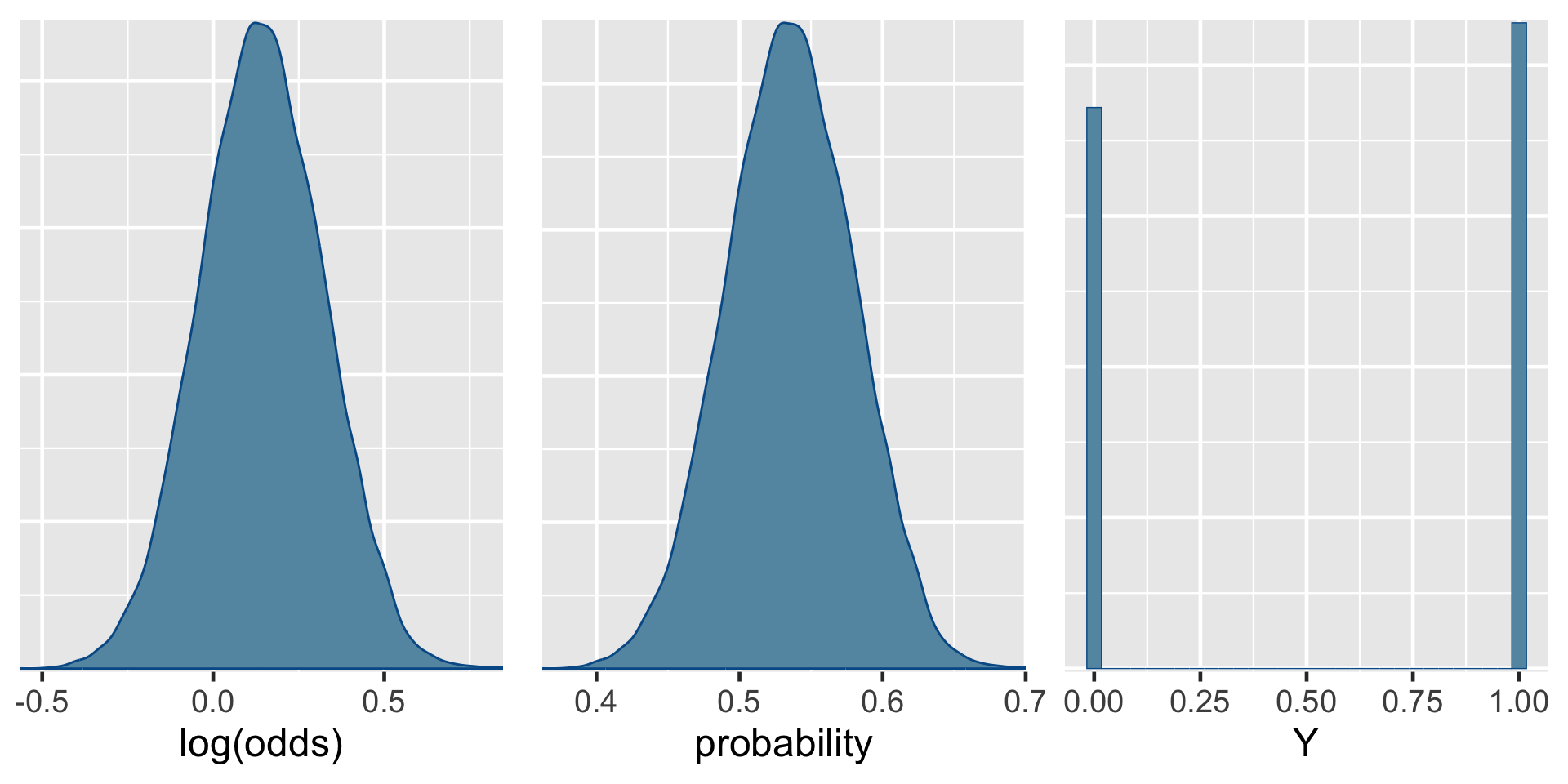 \(\text{likelihood model:} \; \; \; Y_i | \beta_0, \beta_1 \;\;\;\stackrel{ind}{\sim} \text{Bern}(\pi_i)\text{ with } log(\frac{\pi_i}{1-\pi_i}) = \beta_0 + \beta_1X_{i1}\)