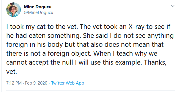 When we see a black cow, we reject the null hypothesis and conclude that there is a black cow in the world.