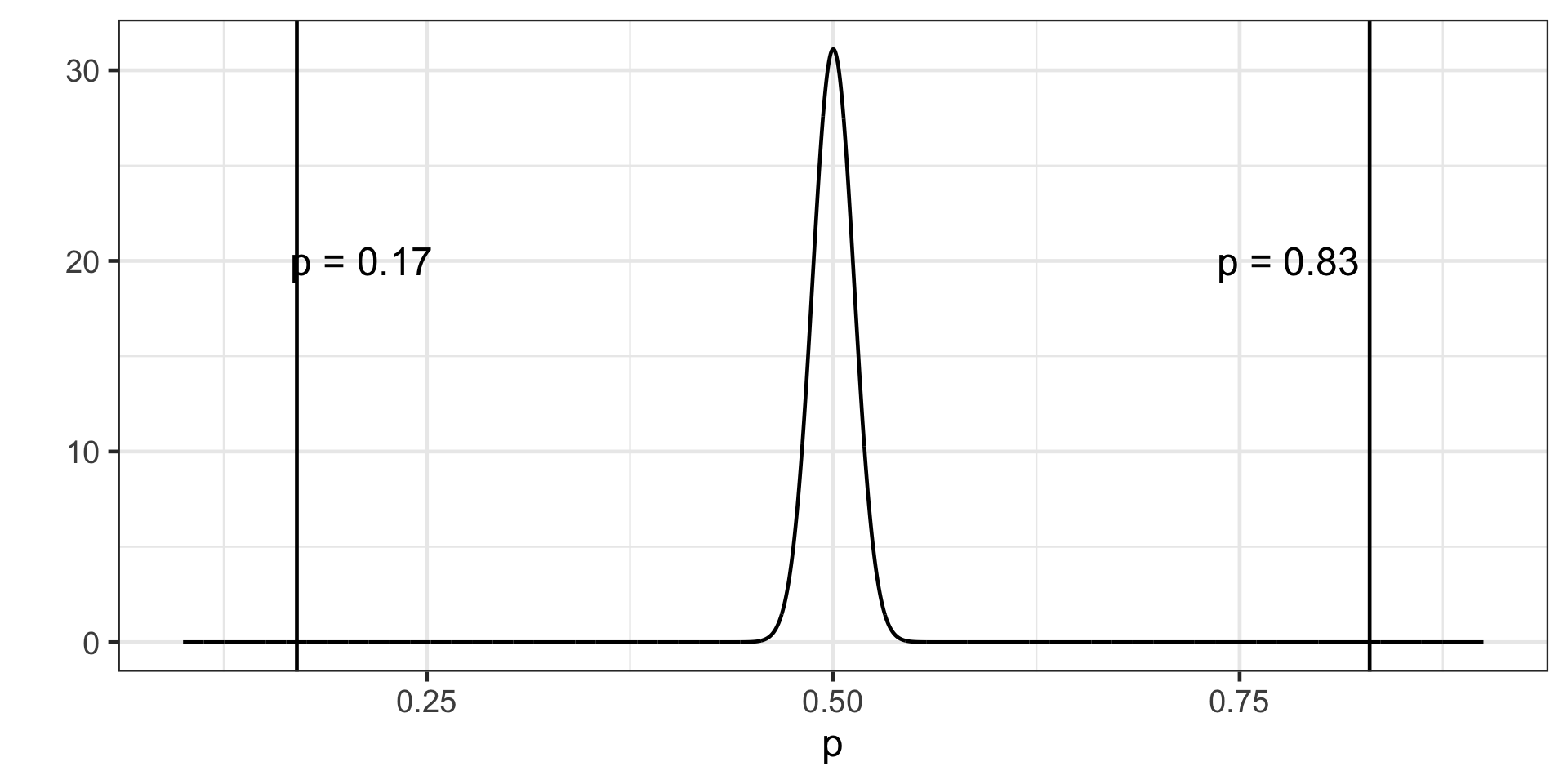 If the null hypothesis ( \(H_0 = \pi = 0.5\) ) were true, then it would be quite improbable (\(p\) = \(5.188482 \times 10^{-146}\)) to observe a sample proportion that is at least extreme like the one we observed. We consider this “quite improbable” since \(p\) < 0.05.