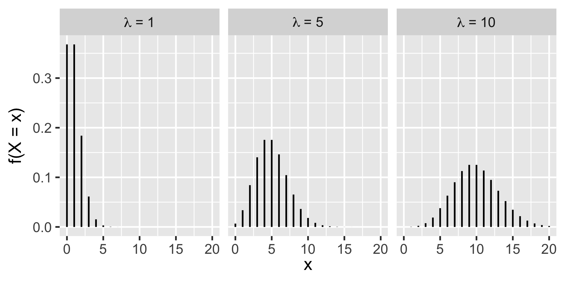 \(P(X = x) = f(x) =\frac{\lambda^x}{x!} e^{-\lambda}\)