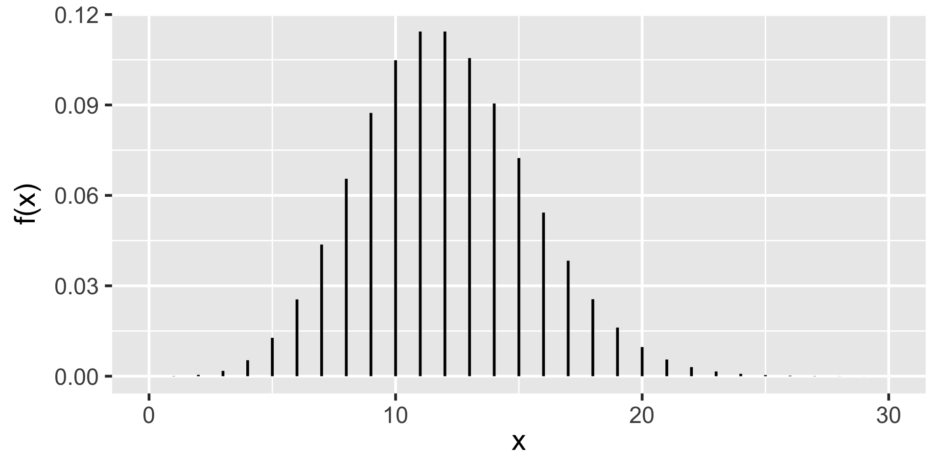 \(P(X = 7) = f(7) = \frac{12^7}{7!} e^{-12} = 0.04368219\)